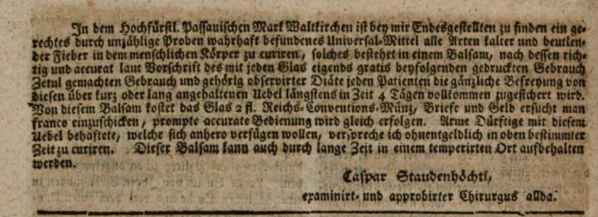 S: Kann sie’s schon in meinem Beitrag im europäischen Staatsrelations Wochenstück vom 10. Septembri 1784 lesen! Im hochfürstlichen Markt Waldkirchen bei mir gibt’s ein Universal-Mittel gegen alle Arten kalter und beutelnder Fieber im menschlichen Körper! Auch einen Gebrauchszetul gereiche ich dazu und unter observierter Diäte sei sie bald gänzlich befreit von der Krankheit. Zwei Gulden kost das Glas! Mir scheint sie nicht so dürftig, dass sie ohnentgeldlich curiert zu werden müsst. Die gänzliche Befreiung von ihrem Übel in vier Tagen kann ich ganz garantieren! Wie sie sich kleidet, kommt sie sicher aus einer weit entfernten Kultur nur für meinen Balsam?