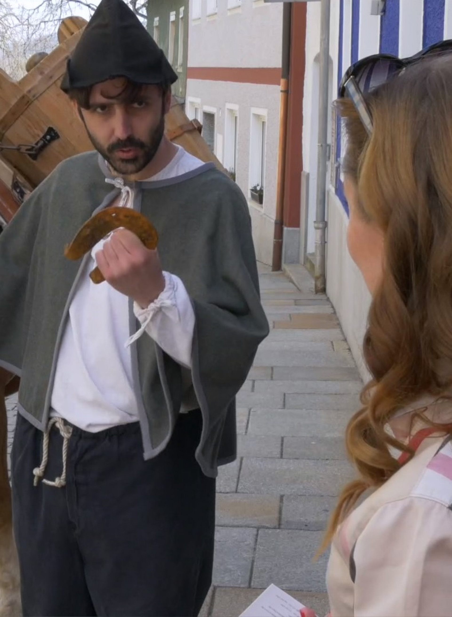 S: Verkleidet? Ich bin ein Säumer und wandre gen Böheim. Nur mein teuer Pferd ist das Hufeisen gebrochen und muss zum Schmid hier im Markt. Auch muss ich halten Rast allda – so will’s der Brief des Bischof. Nach Beschlag und Schlaf bin ich einige Münzen leichter und muss auf gen Wallern und zuletzt gen Prachatiz. Und dann gilt’s: Korn um Salz. Mein teuer Salz will nähren hungrige Mäuler mit dem Korn, das ich dafür bringe.