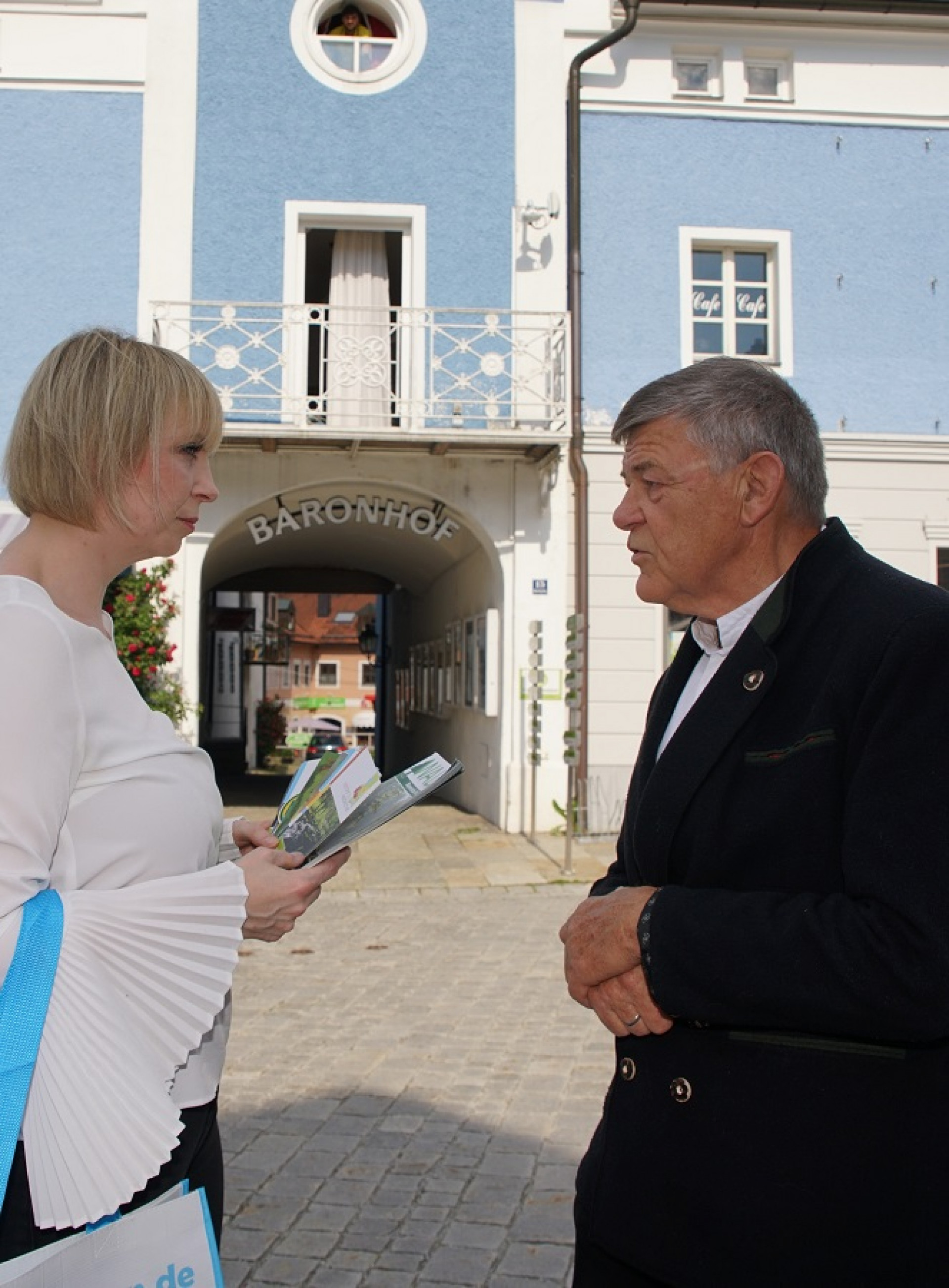 R: Wohnte? Neeein! Ich hab das alles hier besessen, alles …. Und alles verloren. Hier übernahm ich die Brauerei meines Vaters, Anton Ratzesberger. Ich, Anton der Junge, war auch Bürgermeister hier im Ort! Ich hatte großen Reichtum, viel Besitz in ganz Waldkirchen und Umgebung, viele Kinder. Und meine geliebte Frau – stets in neuester Mode, musste nicht ein Kleid zweimal tragen. Ein falscher Berater hat mir dann aber alles geraubt und 1898 musste alles versteigert werden. Gekauft hat es ein Osterhofener für seinen Schwager – den Freiherr von Münster.
