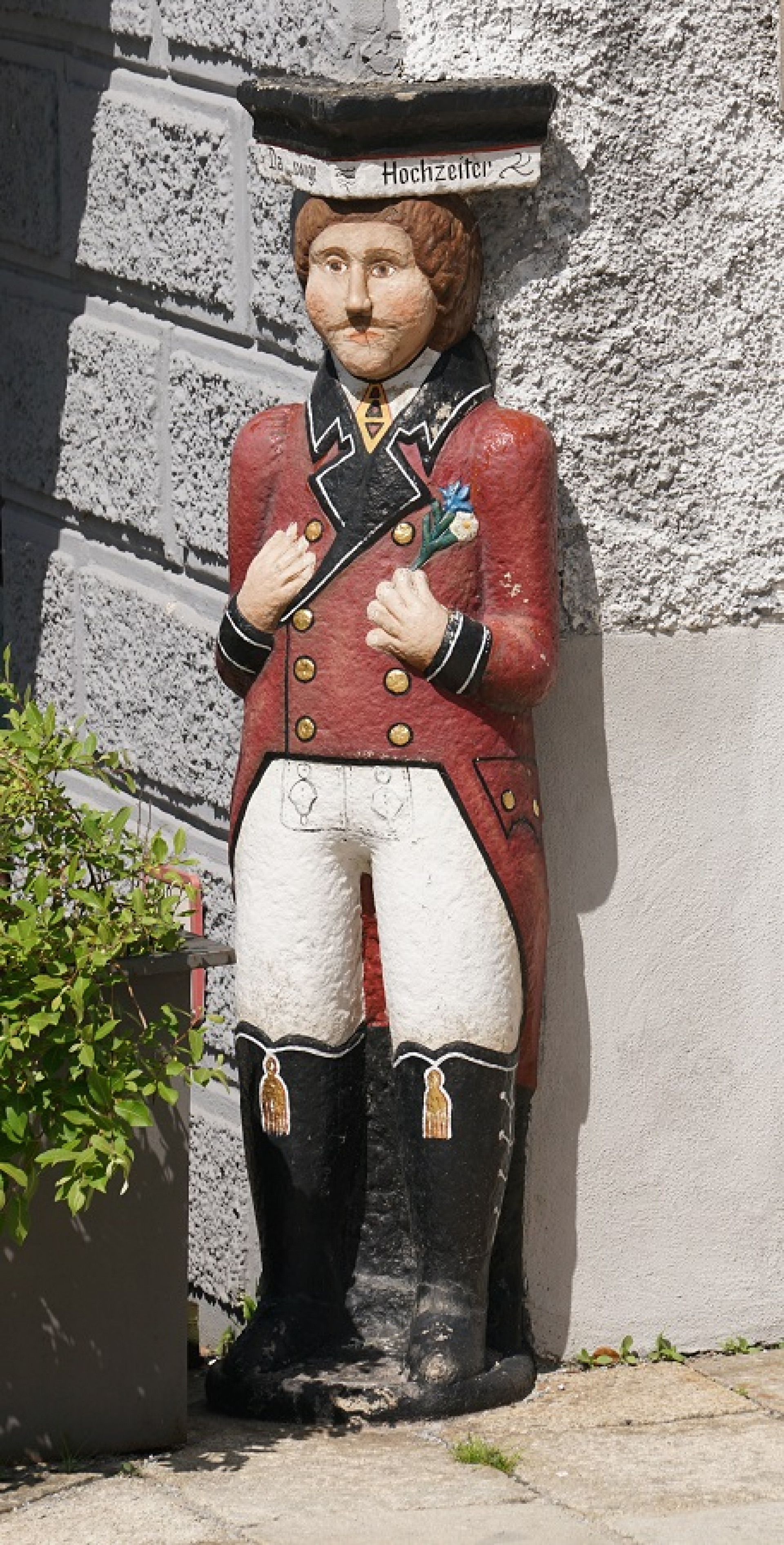 G: O tom existujeřada historek. Někteří říkají, že v domě kdysi bydlel mladý muž, který zůstávaldlouho svobodný, a proto stál každou neděli před kostelem s kyticí v ruce ačekal jako ženich na tu pravou, má to tedy být památka na něj. Jiní tvrdí, žeto byla jen rozpustilost jednoho místního kameníka.